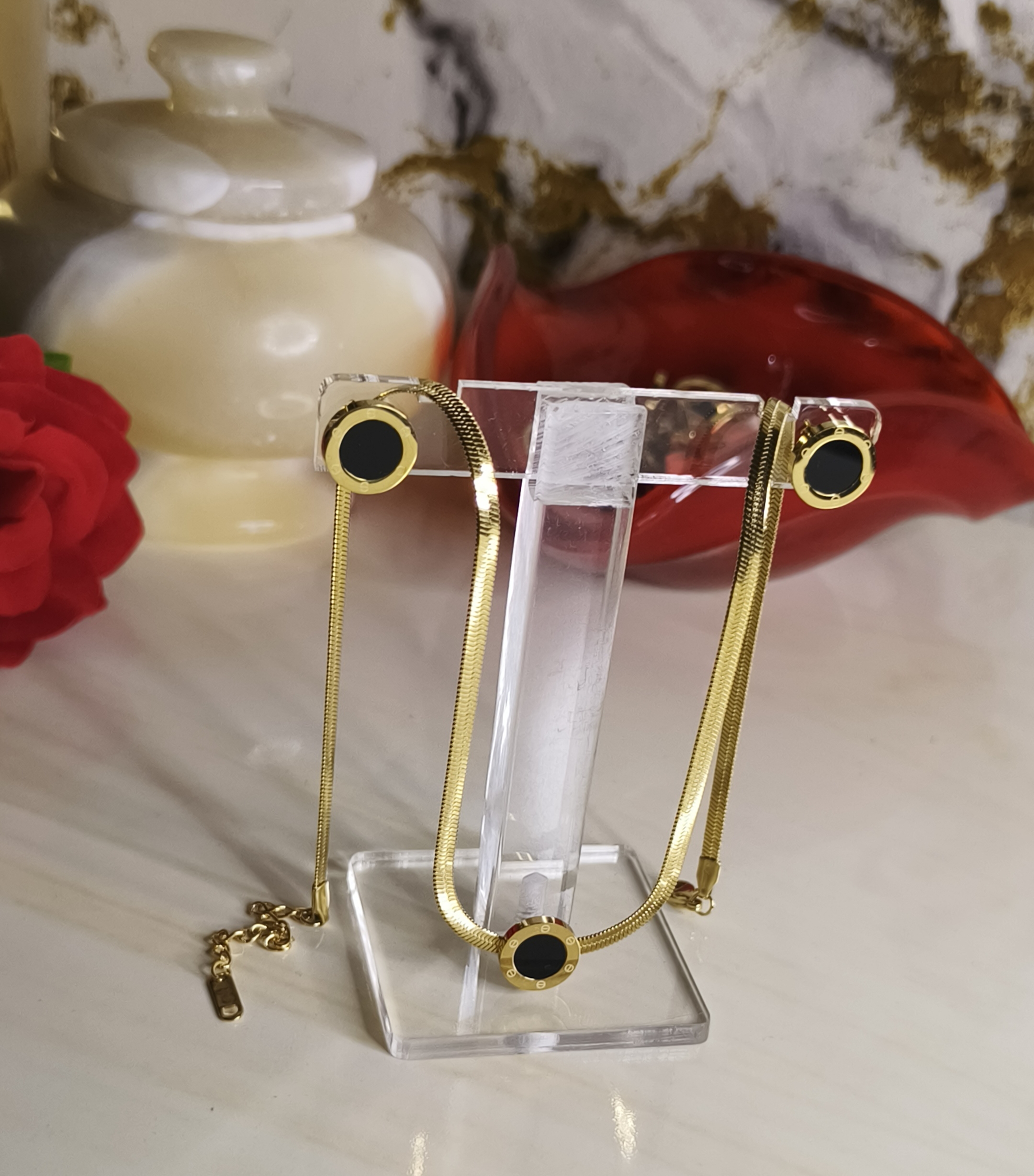 This elegant jewelry set blends black enamel charm with golden luxury, making it a versatile accessory for any outfit.