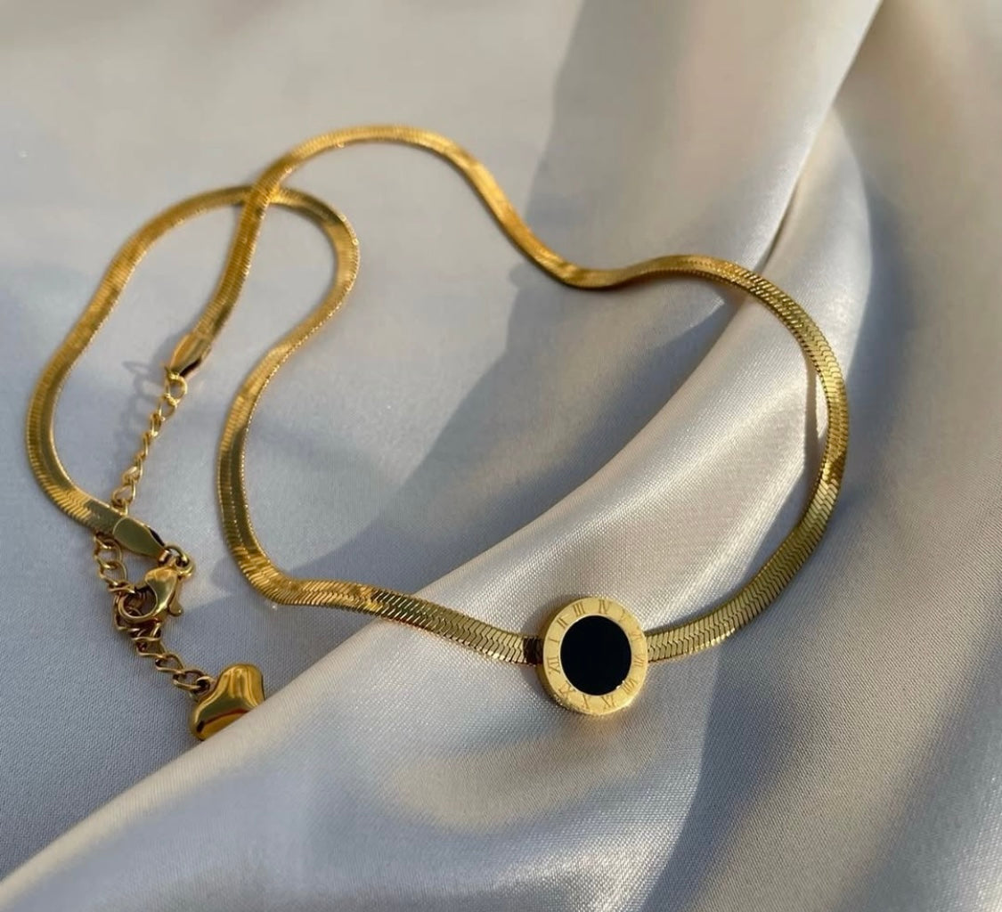 Timeless elegance meets modern minimalism in this Black Roman Pendant with Ear Studs set, crafted from premium gold-plated stainless steel. The round pendant and matching ear studs feature a sleek black stone center, encircled by classic Roman numeral engravings, symbolizing eternal style and sophistication.
